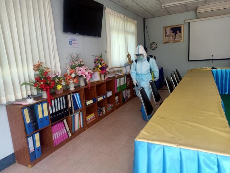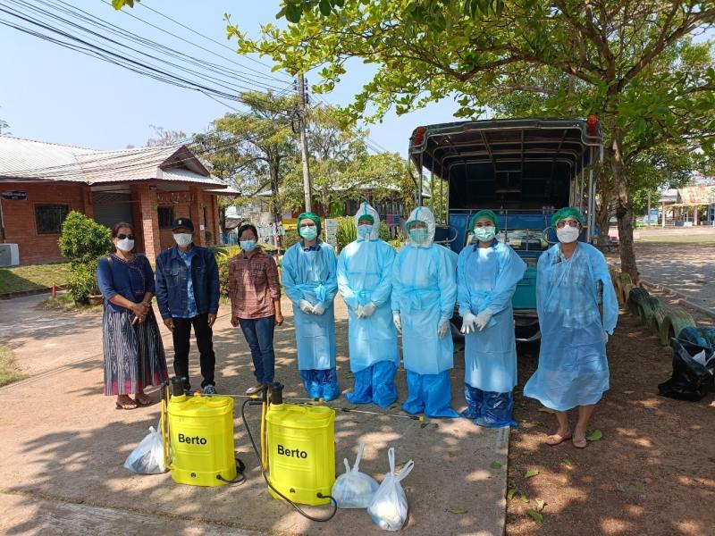 พร้อมด้วย คณะผู้บริหาร พร้อมคณะเจ้าหน้าที่กองสาธารณสุขและสิ่งแวดล้อม ร่วมกับอาสาสมัครประจำเครื่องพ่น หมู่บ้าน(อสพม.) ลงพื้นที่พ่นทำความสะอาดฆ่าเชื้อโควิด- 19
