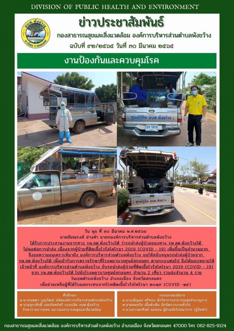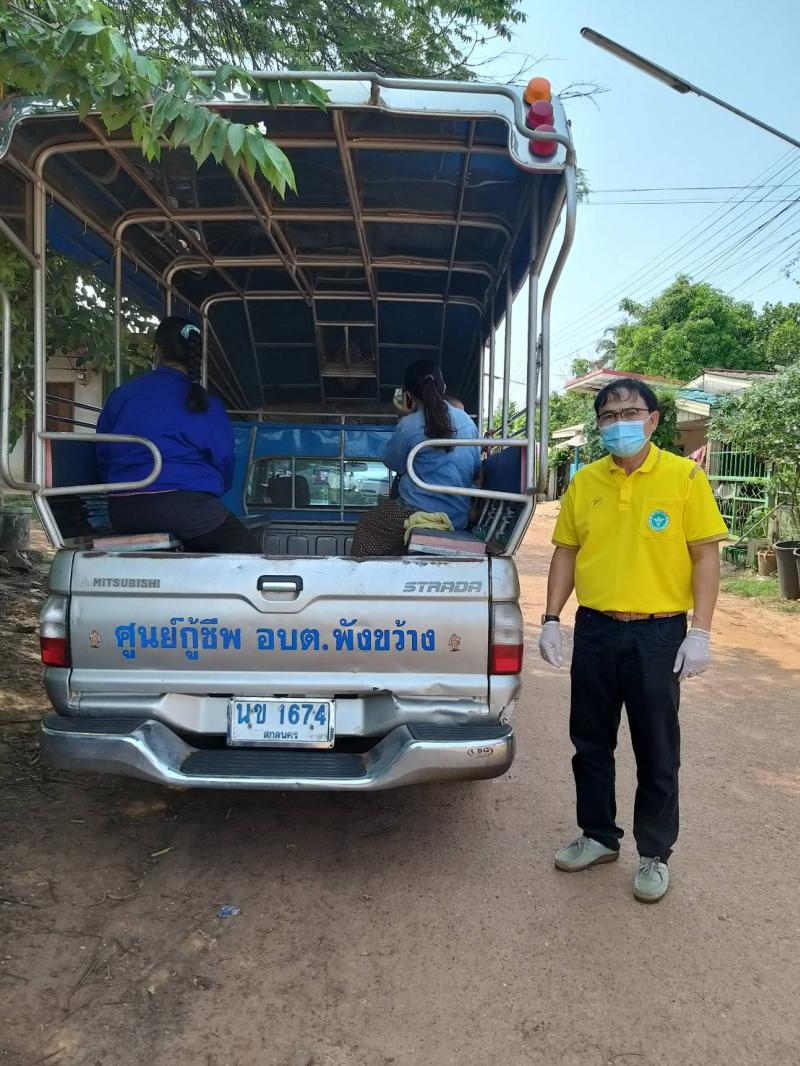 นายชัยณรงค์ อ่างคำ นายกองค์การบริหารส่วนตำบลพังขว้าง ได้รับการประสานงานจากทาง รพ.สต.พังขว้างใต้ ว่ารถนำส่งผู้ป่วยของทาง รพ.สต.พังขว้างใต้ ไม่พอต่อการนำส่ง เนื่องจากผู้ป่วยที่ติดเชื้อไวรัสโคโรนา 2019 (COVID - 19) เพิ่มขึ้นเป็นจำนวนมาก จึงขอความอนุเคราะห์มายัง องค์การบริหารส่วนตำบลพังขว้าง ขอให้สนับสนุนรถนำส่งผู้ป่วยจาก รพ.สต.พังขว้างใต้ เพื่อเข้ารับการตรวจรักษาที่โรงพยาบาลศูนย์สกลนคร ตามระบบต่อไป จึงได้มอบหมายให้ เจ้าหน้าที่ องค์การบริหารส่วนตำบลพังขว้าง ขับรถนำส่งผู้ป่วยที่ติดเชื้อไวรัสโคโรนา 2019 (COVID - 19)จาก รพ.สต.พังขว้างใต้ ไปยังโรงพยาบาลศูนย์สกลนคร จำนวน 1 เที่ยว รวมส่งจำนวน 6 รายในเขตตำบลพังขว้าง อำเภอเมือง จังหวัดสกลนคร เพื่อช่วยเหลือผู้ที่ได้รับผลกระทบจากโรคติดเชื้อไวรัสโคโรนา ๒๐๑๙ (COVID -๑๙)