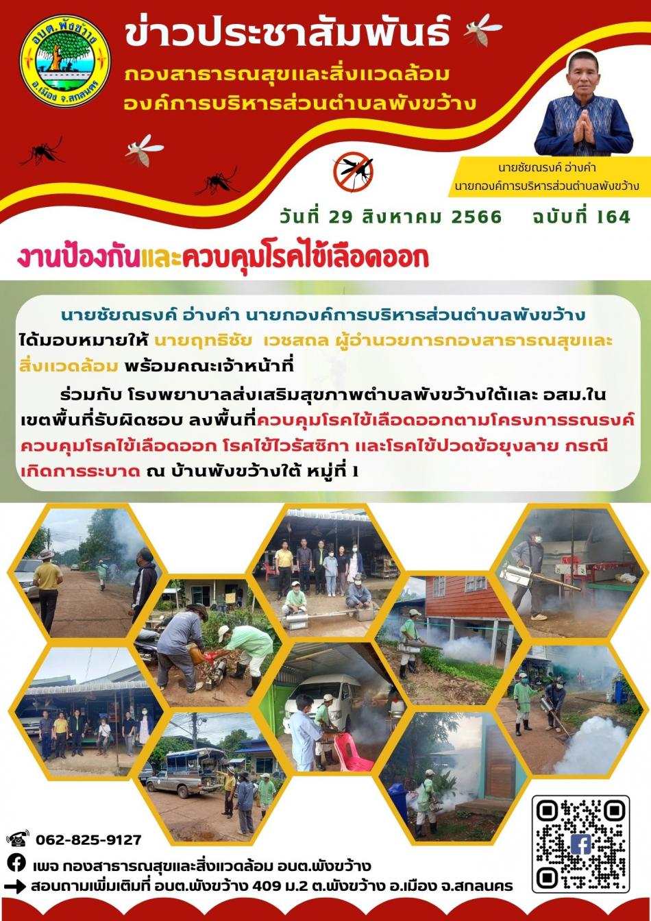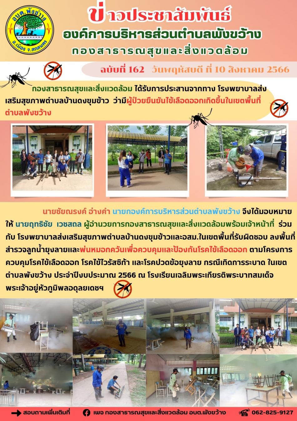 กองสาธารณสุขและสิ่งแวดล้อม ได้รับการประสานจากทาง โรงพยาบาลส่งเสริมสุขภาพตำบลบ้านดงขุมข้าว ว่ามีผู้ป่วยยืนยันไข้เลือดออกเกิดขึ้นในเขตพื้นที่ตำบลพังขว้าง [10 สิงหาคม 2566]