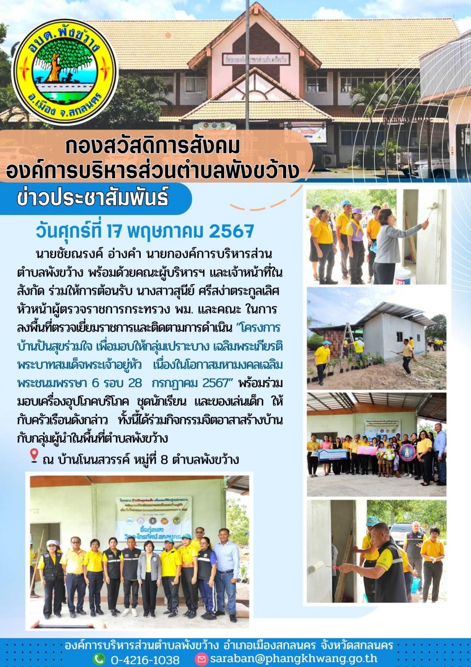 อบต.พังขว้าง ร่วมพิธีมอบบ้านโครงการเฉลิมพระเกียรติพระบาทสมเด็จพระเจ้าอยู่หัว เนื่องในโอกาสมหามงคลเฉลิมพระชนมพรรษา 6 รอบ 28 กรกฎาคม 2567 ให้ผู้ประสบวาตภัยและยากไร้ในพื้นที่ [24 พฤษภาคม 2567]
