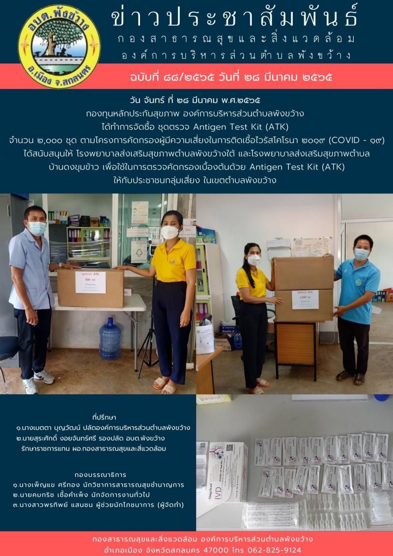 รายละเอียด : วัน พฤหัสบดี ที่ ๒๔ มีนาคม พ.ศ.๒๕๖๕ กองทุนหลักประกันสุขภาพ องค์การบริหารส่วนตำบลพังขว้าง ได้ทำการจัดซื้อ ชุดตรวจ Antigen Test Kit (ATK) จำนวน ๒,๐๐๐ ชุด ตามโครงการคัดกรองผู้มีความเสี่ยงในการติดเชื้อไวรัสโคโรนา ๒๐๑๙ (COVID - ๑๙) ได้สนับสนุนให้ โรงพยาบาลส่งเสริมสุขภาพตำบลพังขว้างใต้ และโรงพยาบาลส่งเสริมสุขภาพตำบล บ้านดงขุมข้าว เพื่อใช้ในการตรวจคัดกรองเบื้องต้นด้วย Antigen Test Kit (ATK) ให้กับประชาชนกลุ่มเสี่ยง ในเขตตำบลพังขว้าง