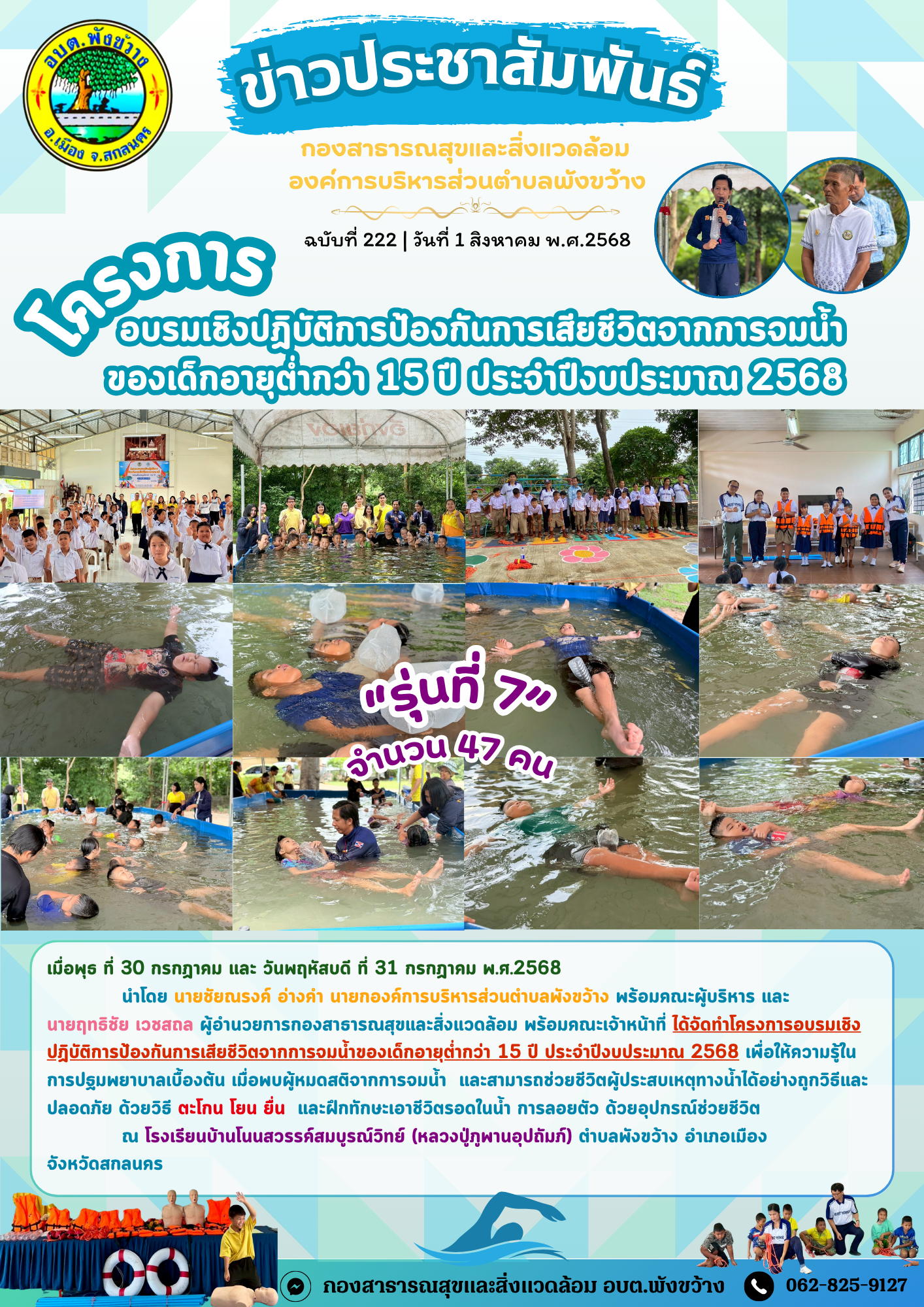 โครงการอบรมเชิงปฏิบัติการป้องกันการเสียชีวิตจากการจมน้ำ ของเด็กอายุต่ำกว่า 15 ปี ประจำปีงบประมาณ 2568 (รุ่นที่ 7) [1 สิงหาคม 2568]