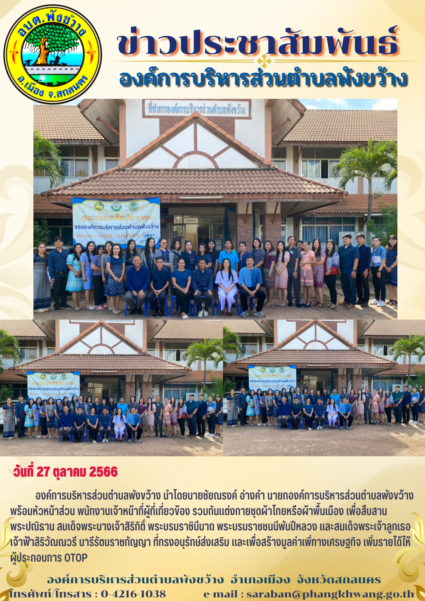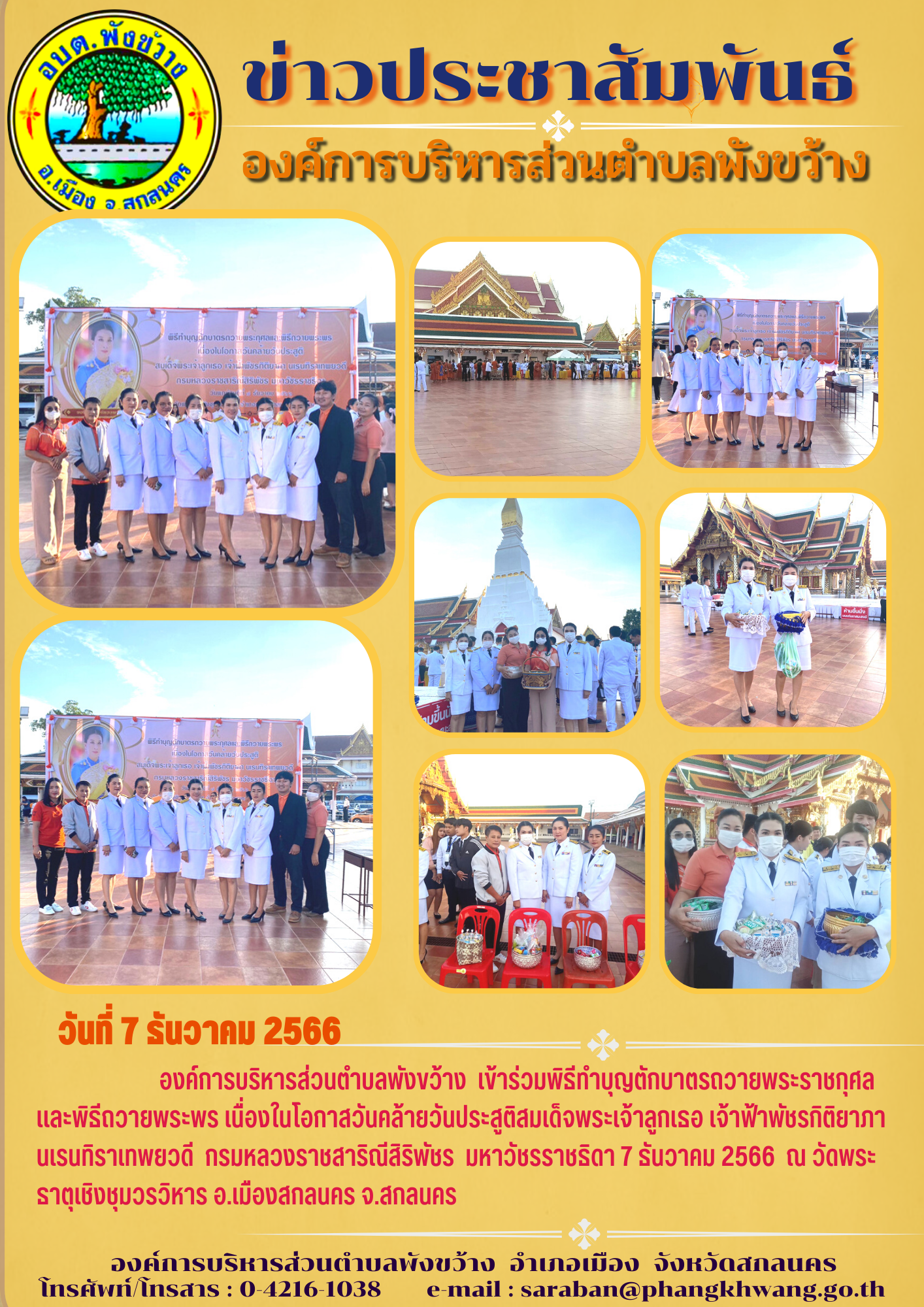 วันที่ 7 ธันวาคม 2566 องค์การบริหารส่วนตำบลพังขว้าง เข้าร่วมพิธีทำบุญตักบาตรถวายพระราชกุศลและพิธีถวายพระพร เนื่องในโอกาสวันคล้ายวันประสูติสมเด็จพระเจ้าลูกเธอ เจ้าฟ้าพัชรกิติยาภา นเรนทิราเทพยวดี ... [7 ธันวาคม 2566]