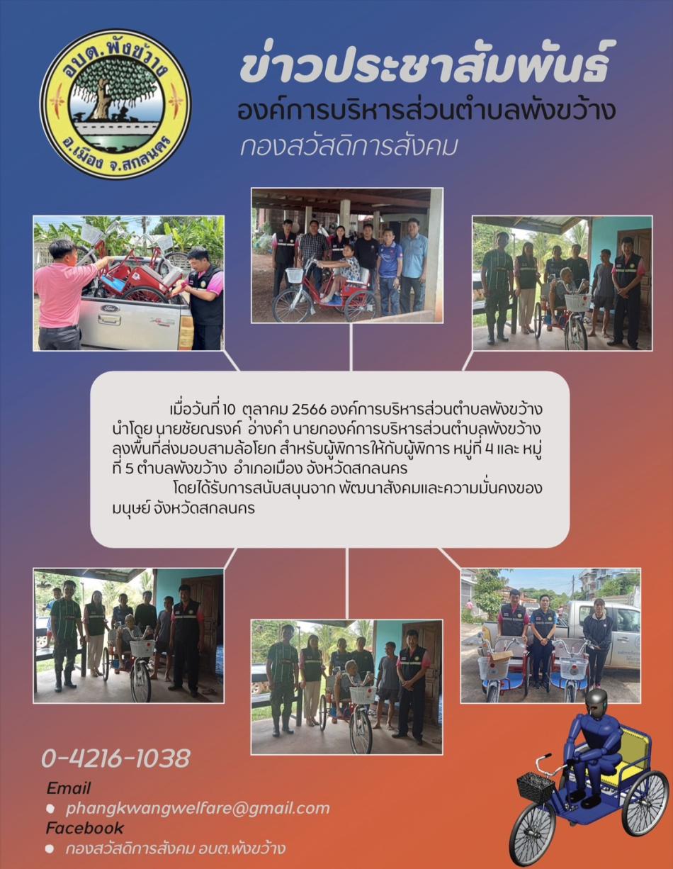 เมื่อวันที่ 10 ตุลาคม 2566 อบต.พังขว้าง นำโดย นายชัยณรงค์ อ่างคำ นายก อบต.พังขว้าง ลงพื้นที่ส่งมอบสามล้อโยก สำหรับผู้พิการ [10 ตุลาคม 2566]