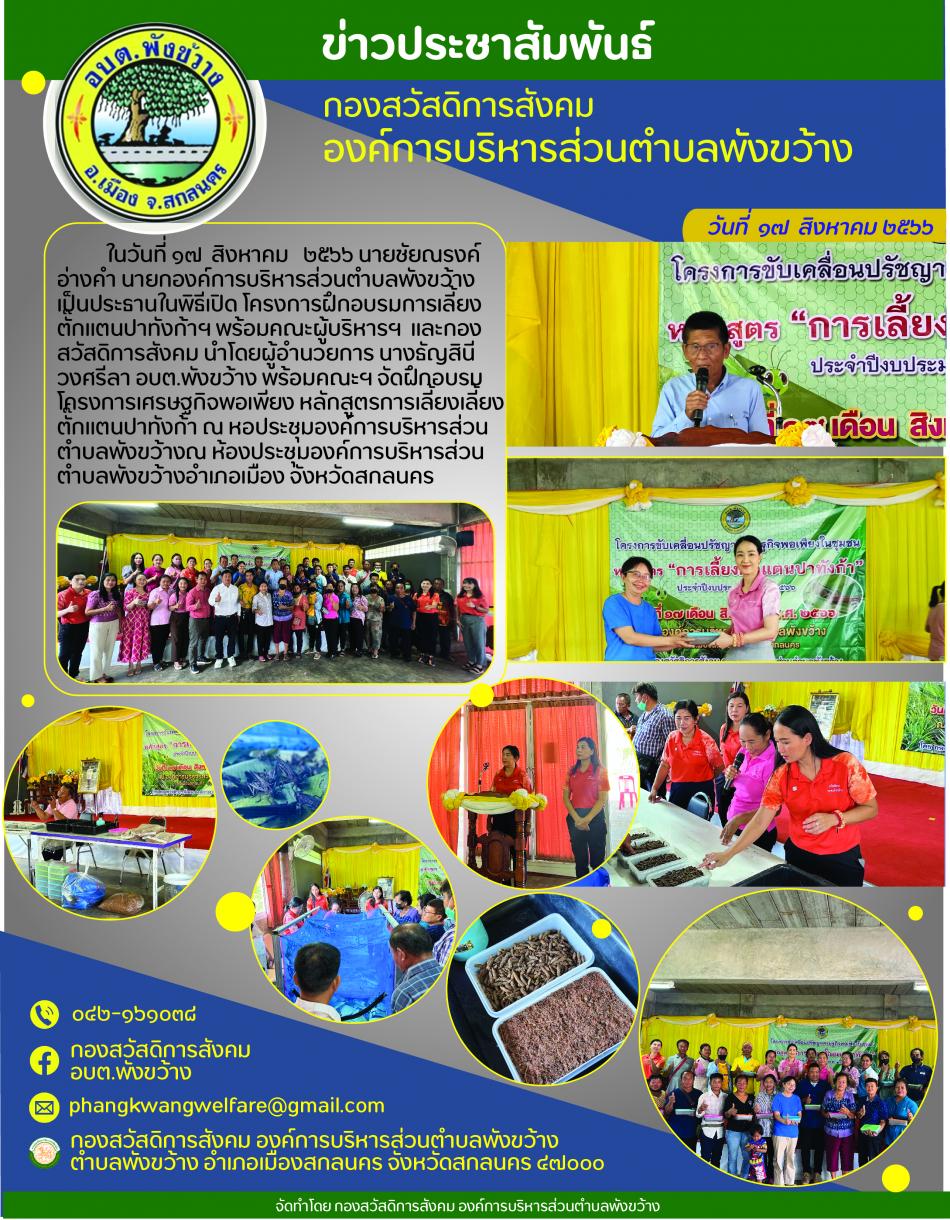 วันที่ ๑๗ สิงหาคม ๒๕๖๖ นายชัยณรงค์ อ่างคำ นายกองค์การบริหารส่วนตำบลพังขว้าง เป็นประธานในพิธีเปิด โครงการฝึกอบรมการเลี้ยง ตั๊กแตนปาทังก้า พร้อมคณะผู้บริหารฯ [17 สิงหาคม 2566]