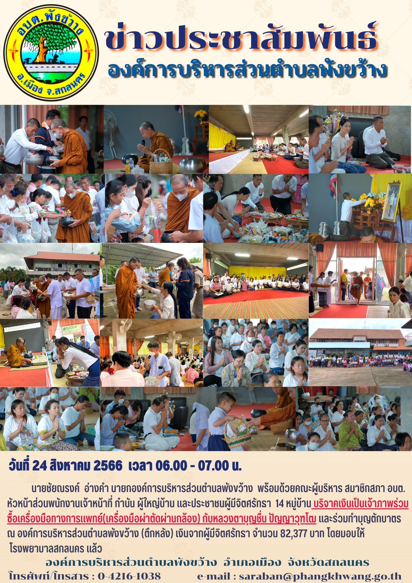 นายชัยณรงค์ อ่างคำ นายกองค์การบริหารส่วนตำบลพังขว้าง พร้อมด้วยคณะผู้บริหาร สมาชิกสภา อบต. หัวหน้าส่วนพนักงานเจ้าหน้าที่ กำนัน ผู้ใหญ่บ้าน และประชาชนผู้มีจิตศรัทธา 14 หมู่บ้าน... [25 สิงหาคม 2566]