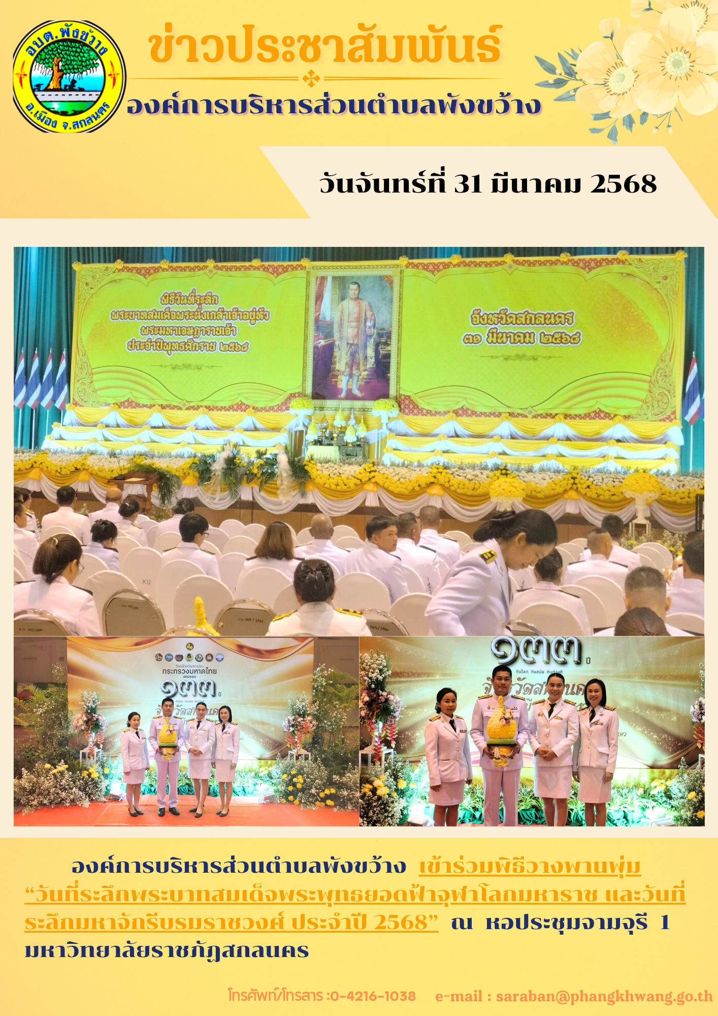 องค์การบริหารส่วนตำบลพังขว้าง เข้าร่วมพิธีวางพานพุ่ม “วันที่ระลึกพระบาทสมเด็จพระพุทธยอดฟ้าจุฬาโลกมหาราช และวันที่ระลึกมหาจักรีบรมราชวงศ์ ประจำปี 2568” ณ หอประชุมจามจุรี 1 มหาวิทยาลัยราชภัฏสกลนคร [31 มีนาคม 2568]