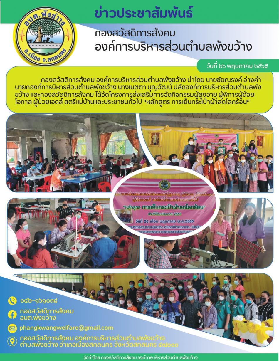 โครงการส่งเสริมการจัดกิจกรรมผู้สูงอายุ ผู้พิการ ผู้ด้อยโอกาส ผู้ป่วยเอดส์ สตรีแม่บ้านและประชาชนทั่วไป “หลักสูตร การเย็บกระเป๋าผ้าลดโลกร้อน” [26 พฤษภาคม 2565]