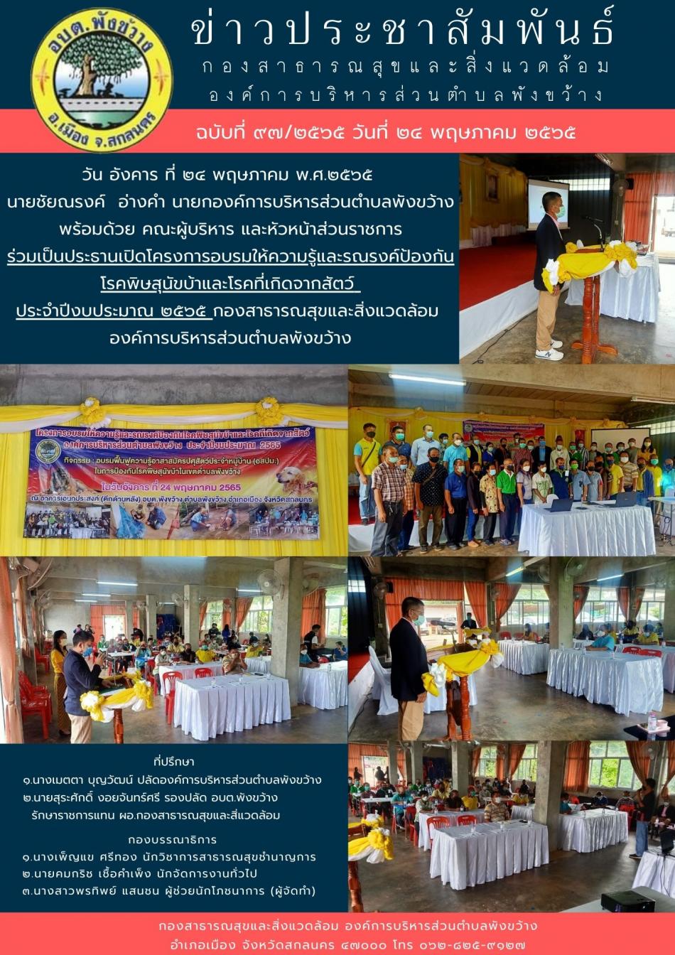 โครงการอบรมให้ความรู้และรณรงค์ป้องกันโรคพิษสุนัขบ้าและโรคที่เกิดจากสัตว์ ประจำปีงบประมาณ 2565 กองสาธารณสุขและสิ่งแวดล้อม องค์การบริหารส่วนตำบลพังขว้าง [24 พฤษภาคม 2565]
