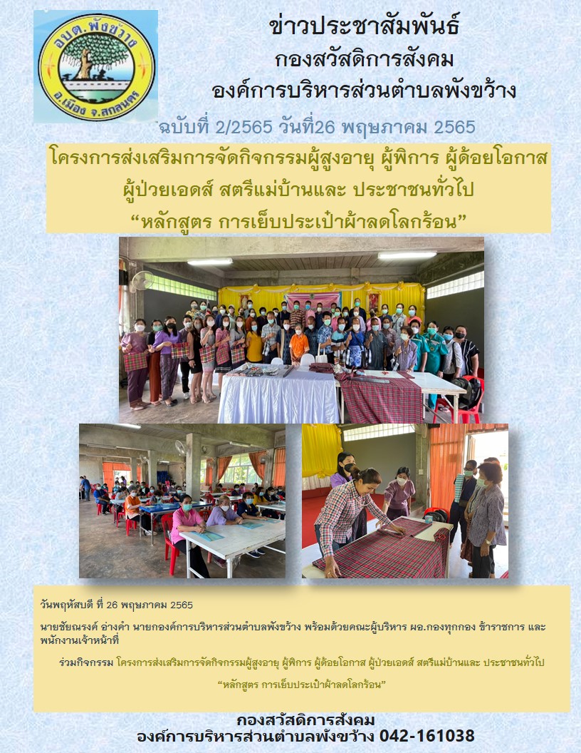 โครงการส่งเสริมการจัดกิจกรรมผู้สูงอายุ ผู้พิการ ผู้ด้อยโอกาส ผู้ป่วยเอดส์ สตรีแม่บ้านและประชาชนทั่วไป "หลักสูตร การเย็บกระเป๋าผ้าลดโลกร้อน"