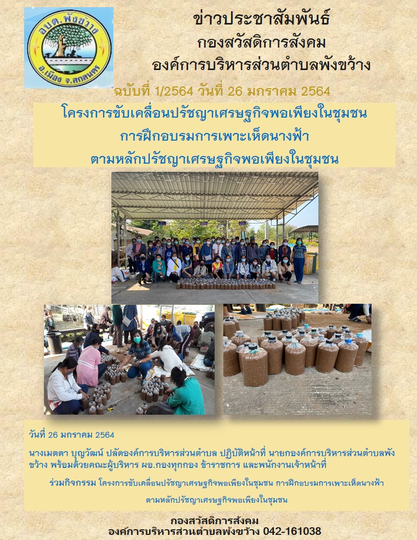 รายละเอียด : โครงการขับเคลื่อนปรัชญาเศรษฐกิจพอเพียงในชุมชน การฝึกอบรมการเพาะเห็ดนางฟ้าตามหลักปรัชญาเศรษฐกิจพอเพียงในชุมชน