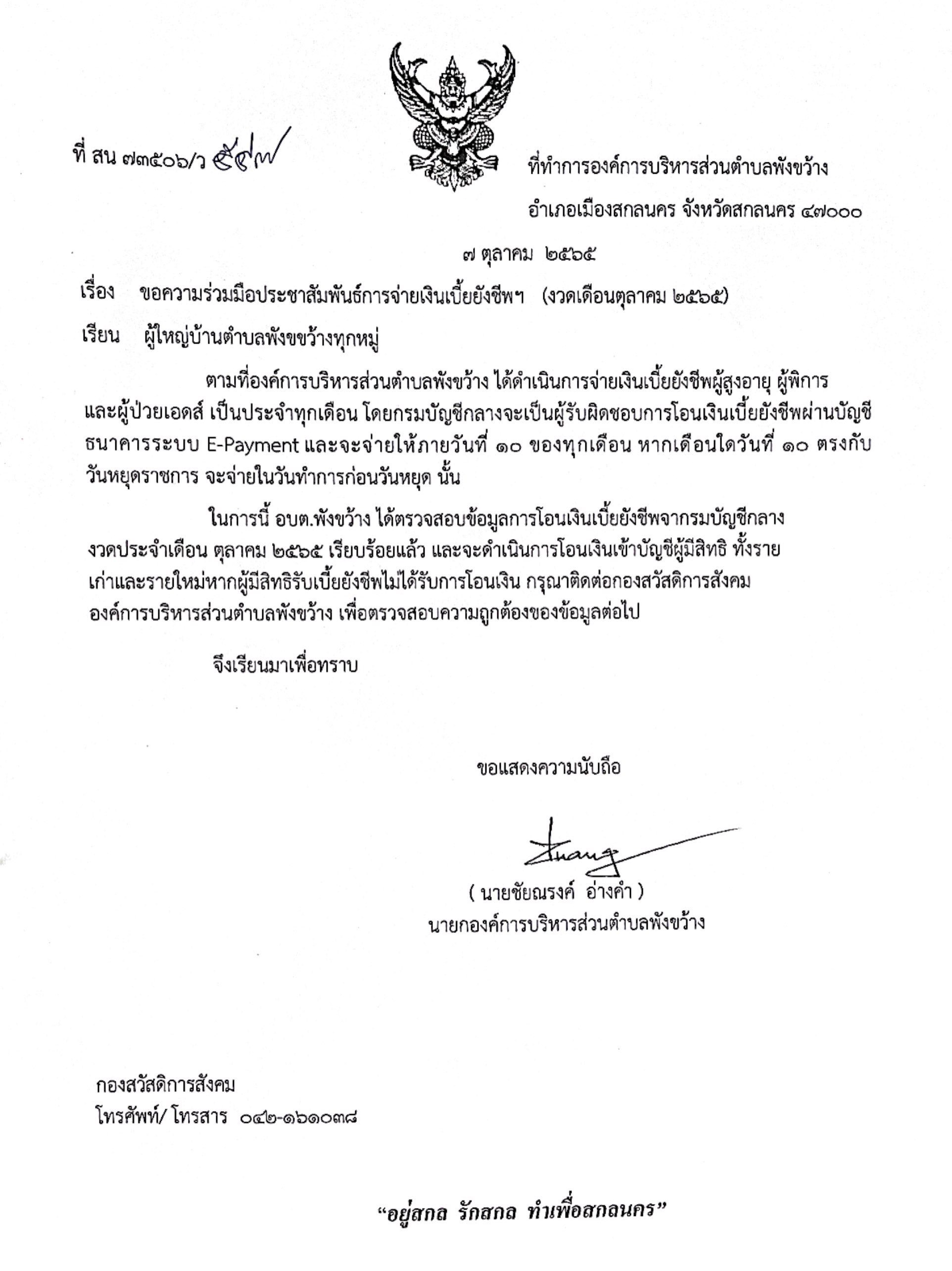ประชาสัมพันธ์เบี้ยยังชีพประจำเดือนตุลาคม 2565