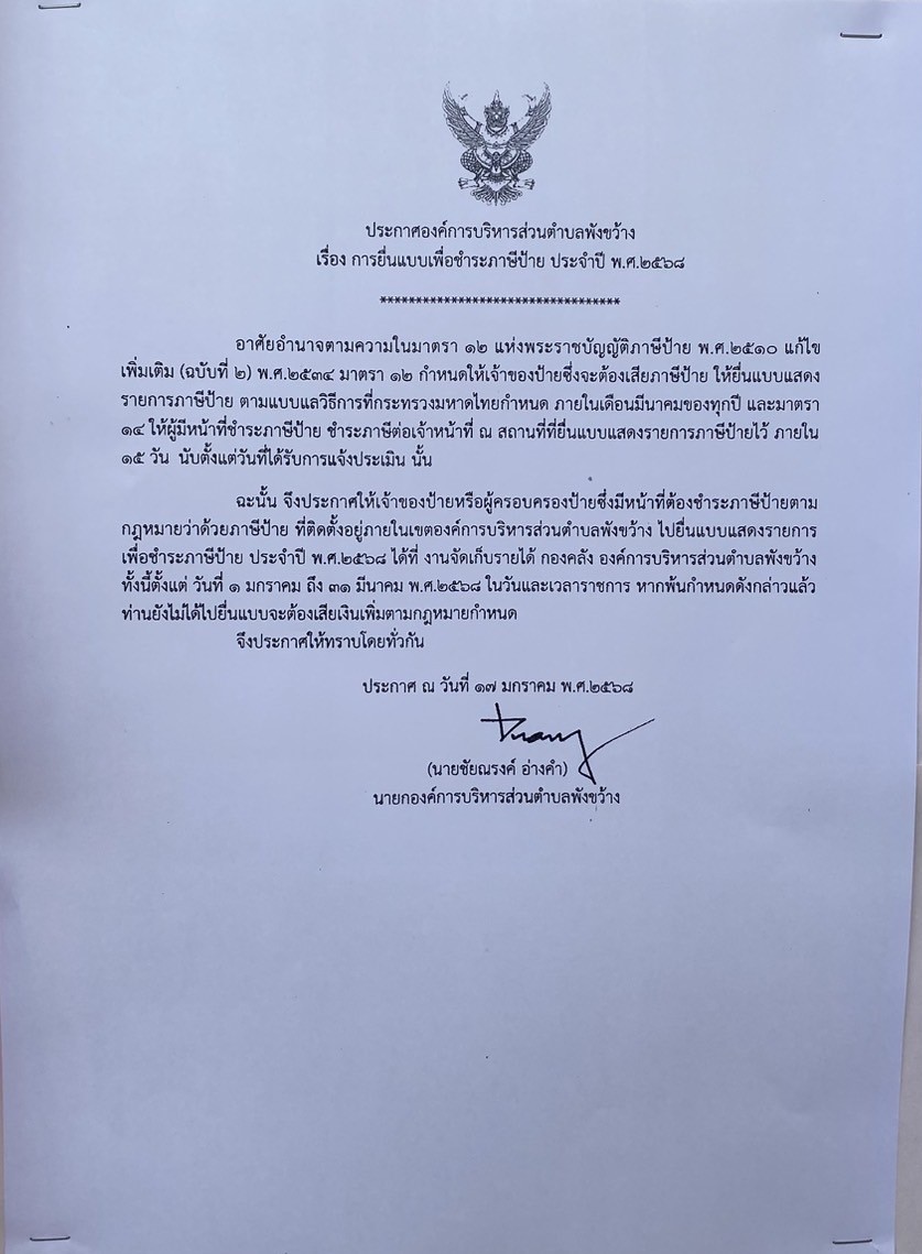 ประกาศองค์การบริการบริหารส่วนตำบลพังขว้าง เรื่อง การยื่นแบบเพื่อชำระภาษีป้าย ประจำปี 2568
